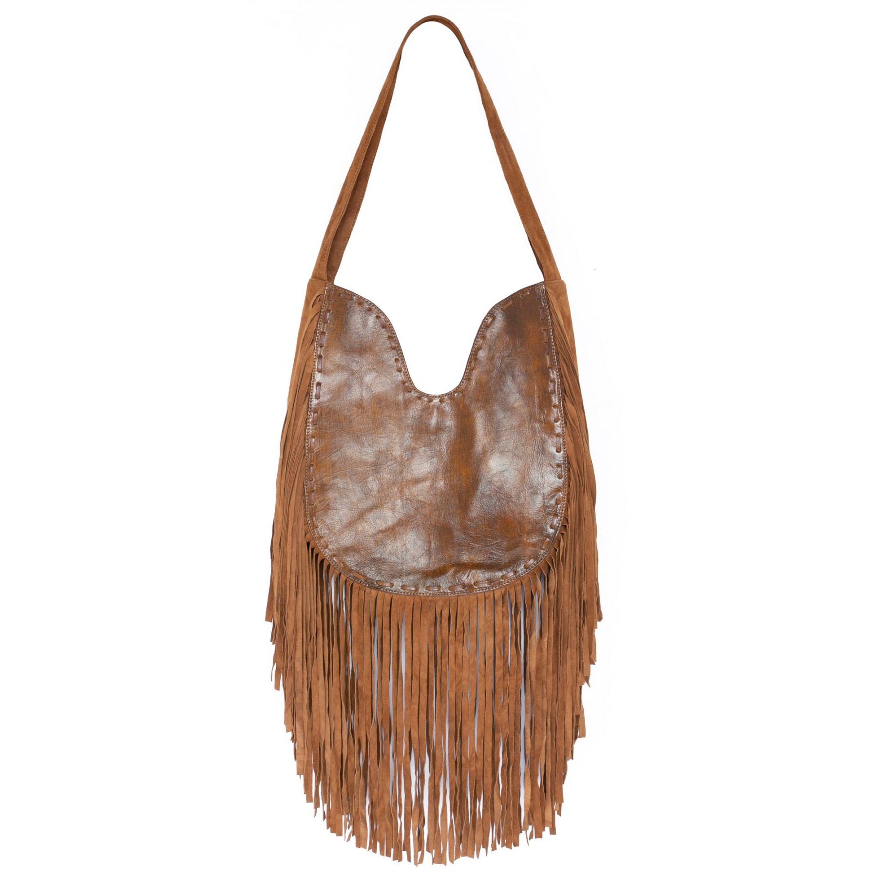 Double fringe detail and handle in Dark Tan suede.