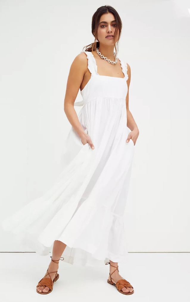Sweet and seasonless maxi dress from the Endless Summer collection featured in a square neck, shapeless silhouette with a ruffled bottom hem for added dimension.
