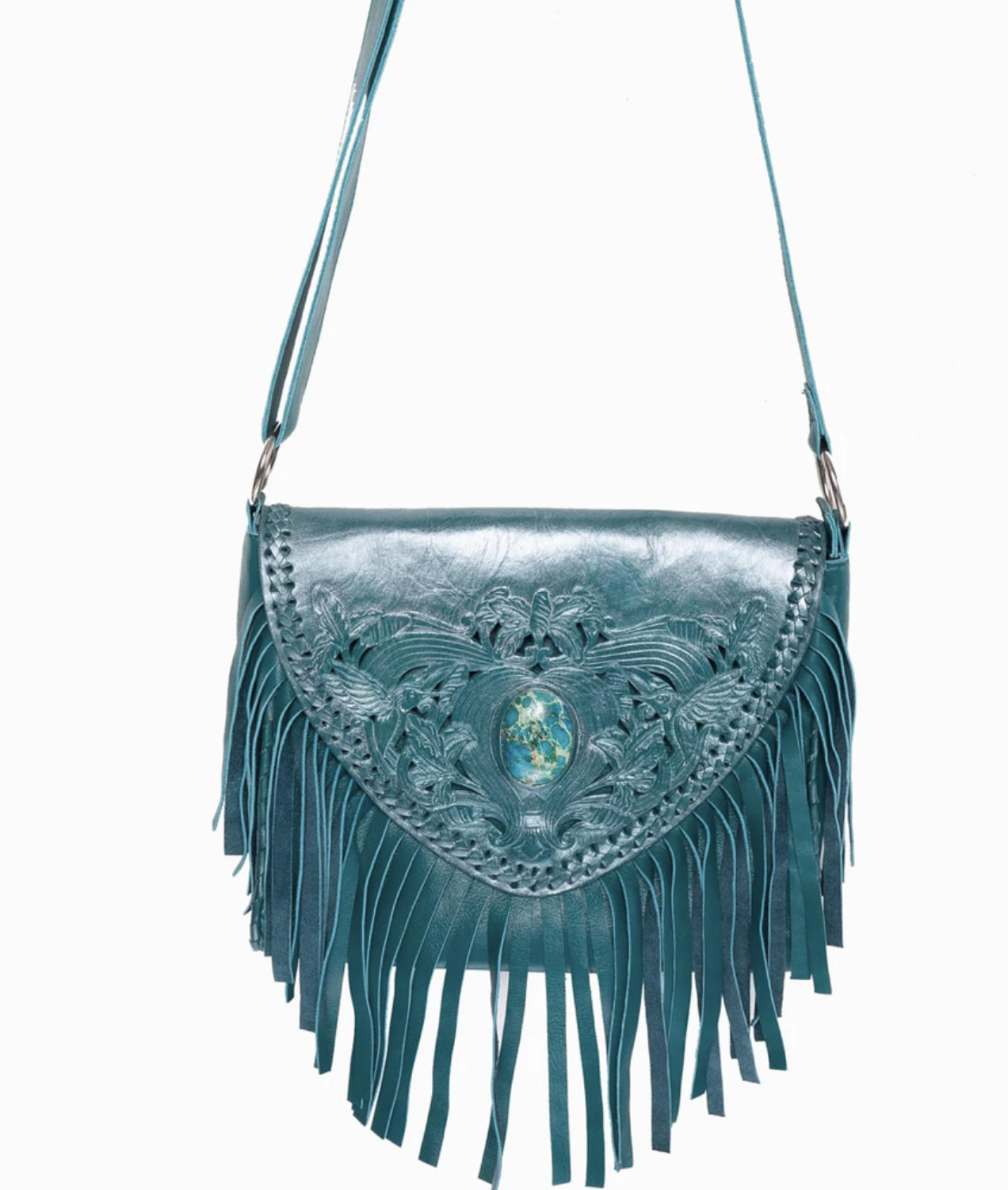Hand-tooled and hand-painted Metallic Teal cow leather flap, Teal cow leather body and handle with a genuine Turquoise stone
