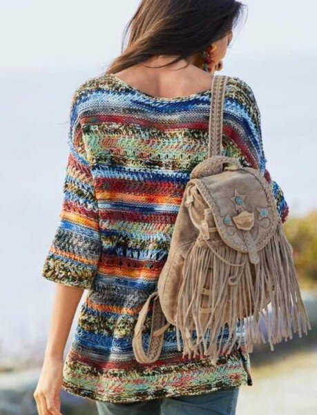 Summer is the Summer version of this incredible backpack that is a smash hit. Featuring flap closure, dramatic fringe, two outer pockets, silver findings, and turquoise beads with adjustable straps. Available in this cream natural colour with gorgeous nuances created by a vintage treatment, our backpack is the perfect combination of style and comfort.