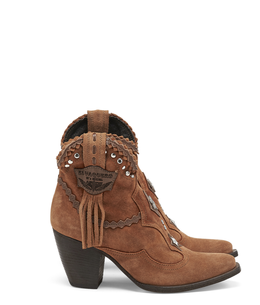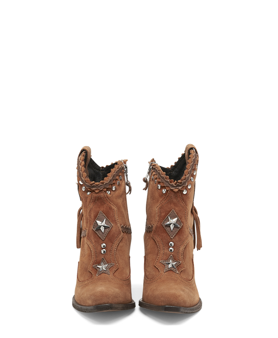 Violet is our Texan ankle boot enriched with beautiful leather details, cool studded detailing along the top, fringes, and an elegant turquoise bead on the front. With its thick 70 mm heel and side zip, Violet is suitable for the most elegant occasions without sacrificing comfort. Scratched and washed with our feature aging technique called “Silverstone” which creates amazing color fluctuations and shades on the suede leather, defining the unique character of our boots. Available in this color inspired by nature and the environment, with contrasting leather details.